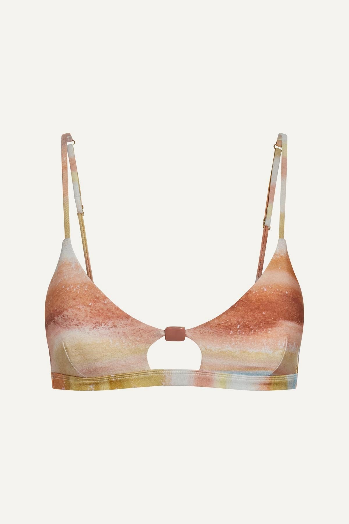 Sleek and sculptural, the Terra Cutout Bralette Top features a curved front cutout framed by a recycled resin bead detail. With adjustable over-the-shoulder straps and removable cups, it offers a customizable fit in a modern bralette silhouette.