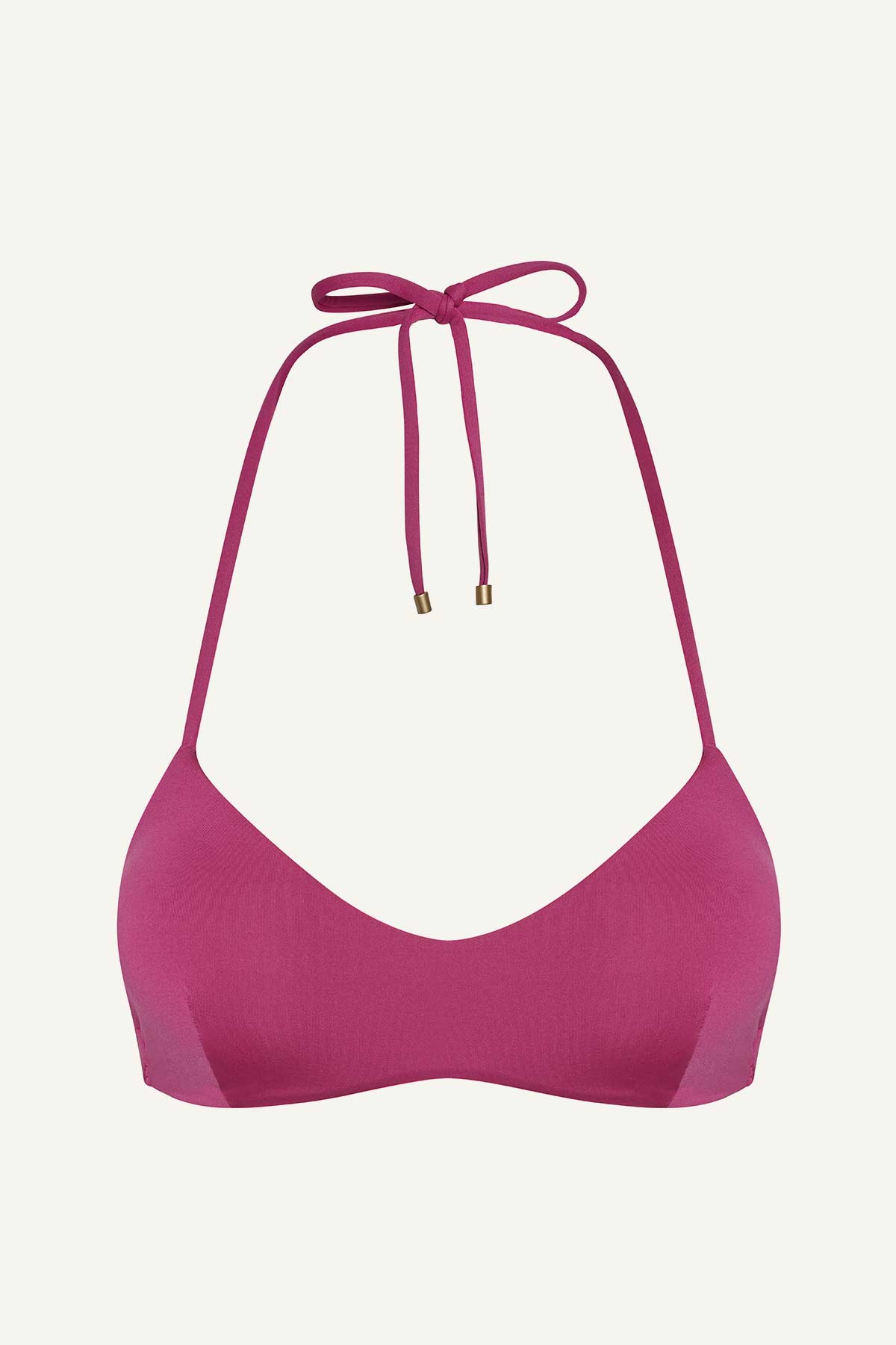 Clean and understated, with flattering lines and a timeless halter tie neck, this scoop bralette bikini top is made from exclusive deadstock fabric.