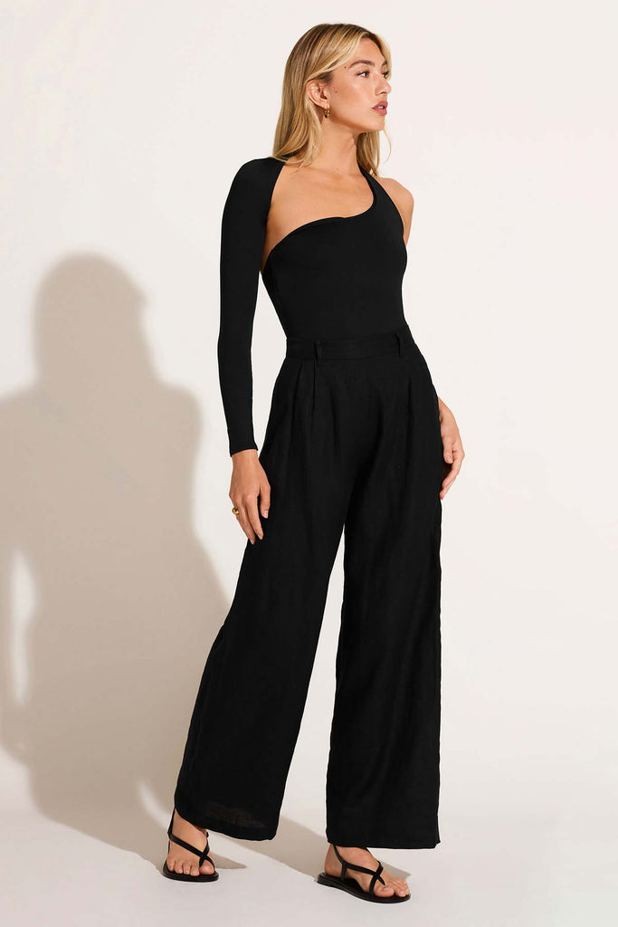 Form meets function. Swim meets iconic style. Alessa Is an asymmetrical one-piece long sleeve bathing suit—perfect for wearing from the beach to dinner and vice versa. The ultimate vacation swimsuit. Pair with The Getaway Pant for the ideal post-swim look.