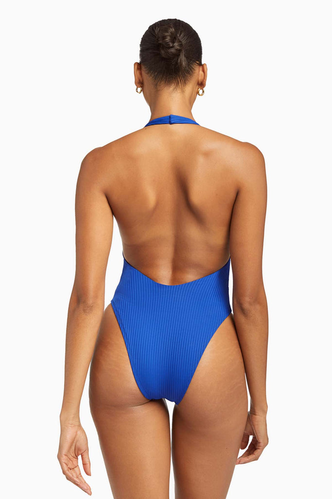 This sleek update on the classic halter top features a sexy scoop back and a high cut leg with cheeky coverage.