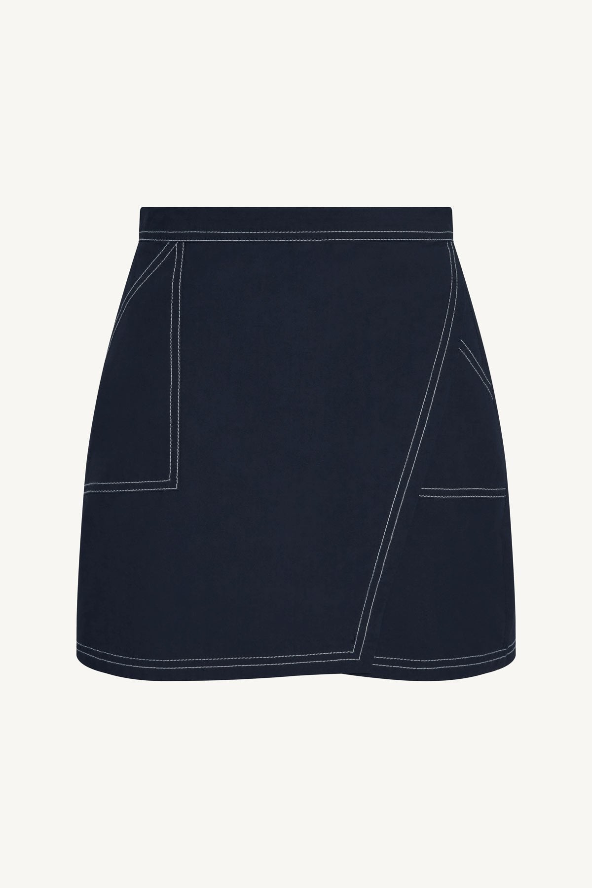 The Ashley Wrap Skirt is a chic, modern mini designed to flatter. Crafted from crisp cotton poplin in Midnight Indigo, it features an adjustable wrap tie for a customizable fit and contrast stitch detailing for a subtle pop. Effortlessly versatile, it pairs with the Ashley Cropped Shirt to take you from a sunny beach day to an evening dinner with ease.
