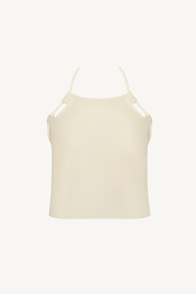 It's in the details. Avery is an anything-but-ordinary spin on a classic minimal halter top. Designed with darts for shape, and features a cotton rope trim with wooden bead detailing that ties at the back for a perfect, adjustable fit.