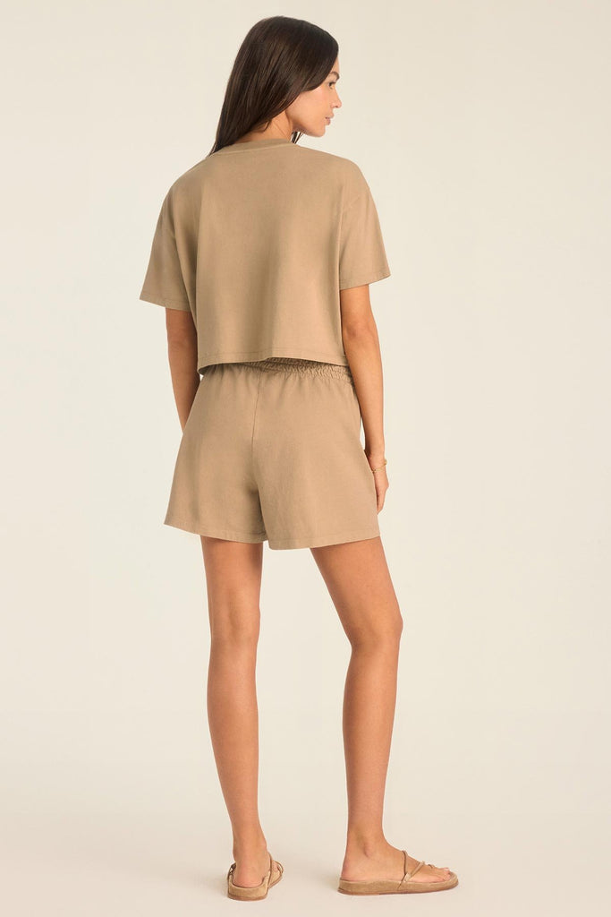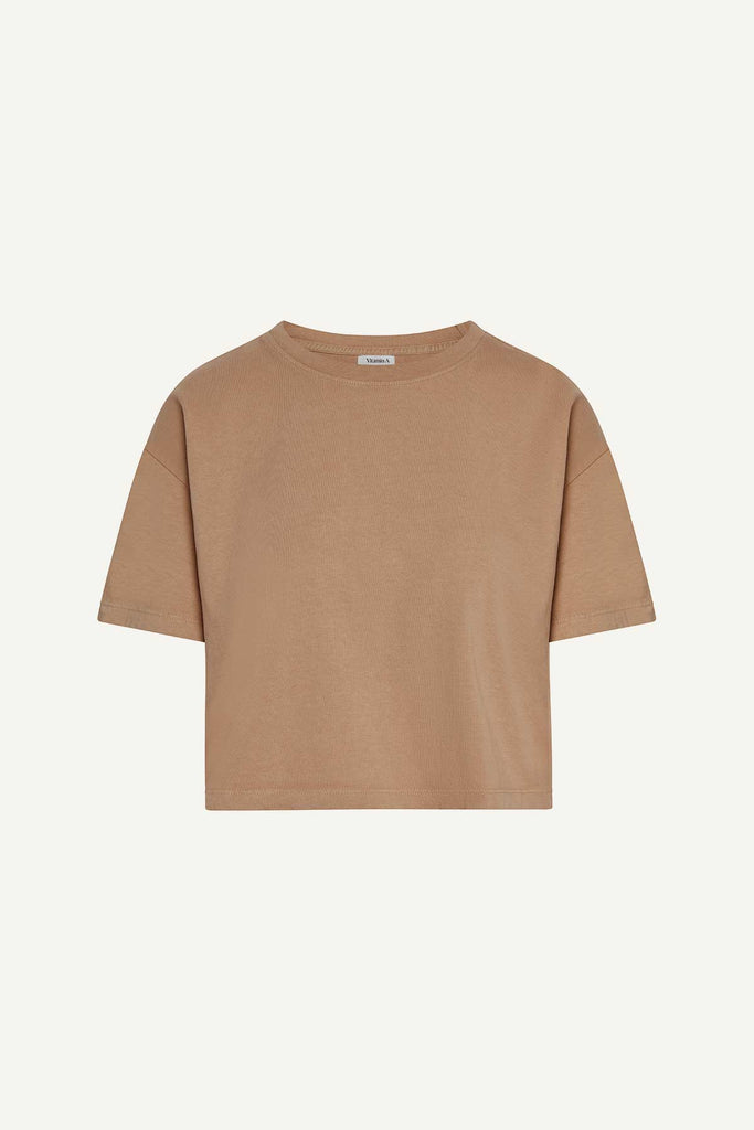 Your favorite tee with a perfect crop. Features a high neckline and ribbed trim, this soft tee is the perfect laid-back cut for everyday. Throw it on and pair with your favorite pant, short, or swim bottom.