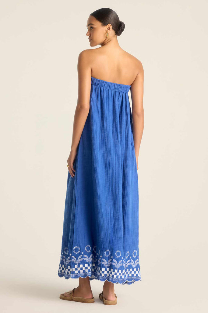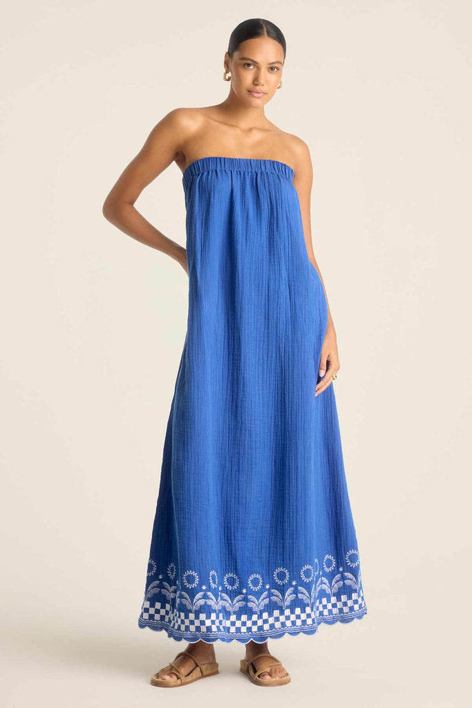 Delicately feminine beachwear. Daya is our organic cotton collection of embroidered beach styles this full length, strapless dress features a wide, elasticated neckline, side seam pockets, and contrasting embroidered trim.