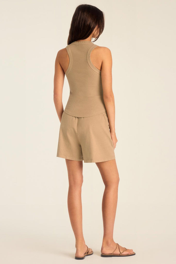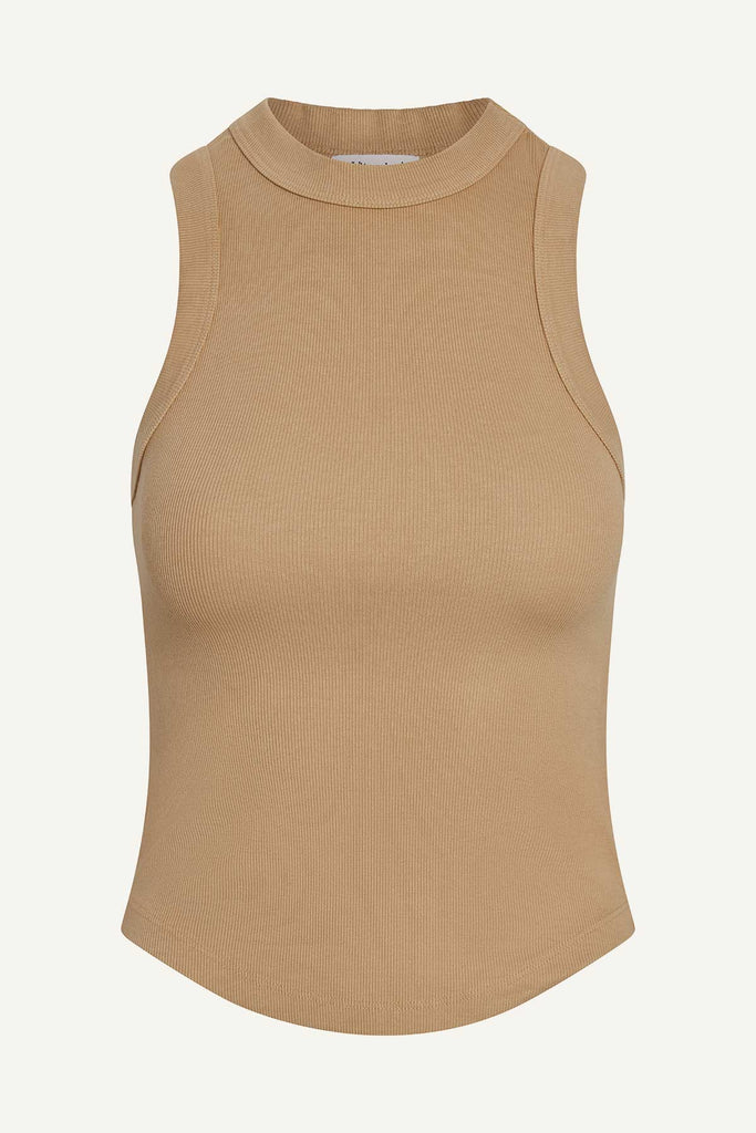 This minimal, racerback tank features a high neck and carefully cut lines. An essential layering piece, it's the perfected fit you'll wear under and over everything.