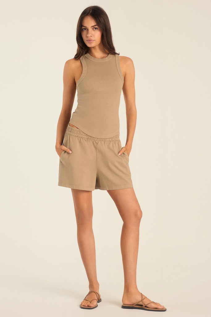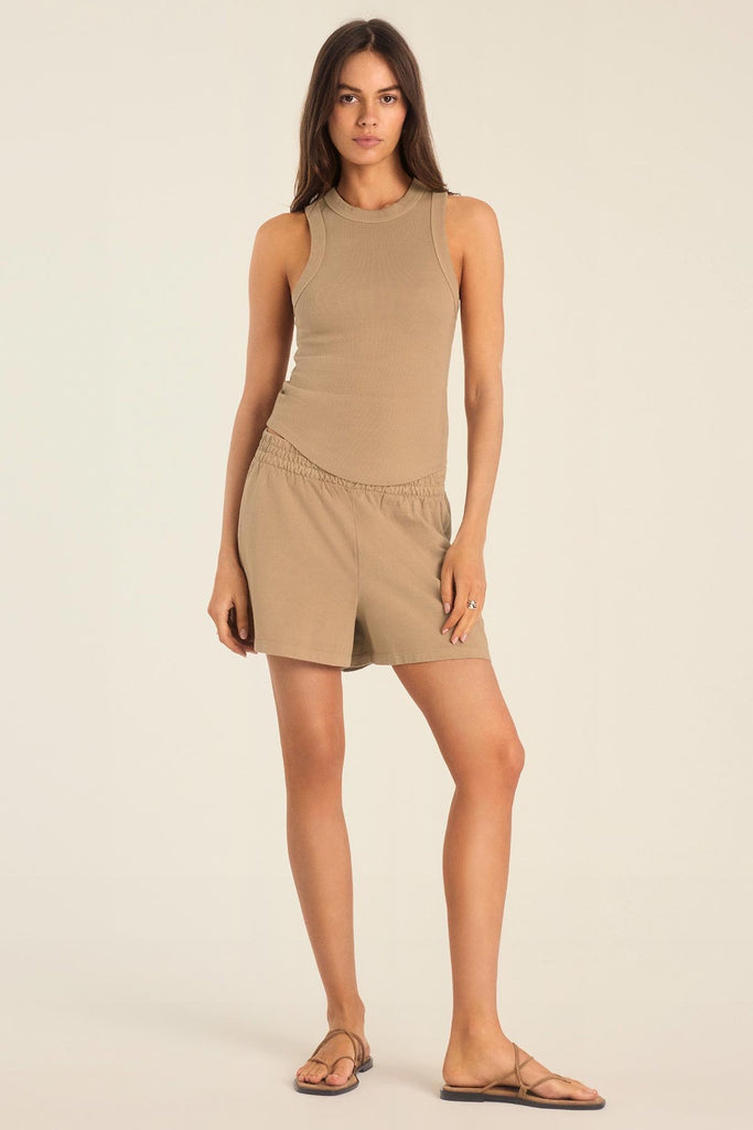 This ultra soft rib is a high stretch, flattering knit crafted from recycled cotton yarns, an eco-friendly, waste reducing material. It's knit with a touch stretch, and is garment dyed (a process that conserves water and reduces fabric waste) for a richly hued color with depth and an effortless, vintage look.