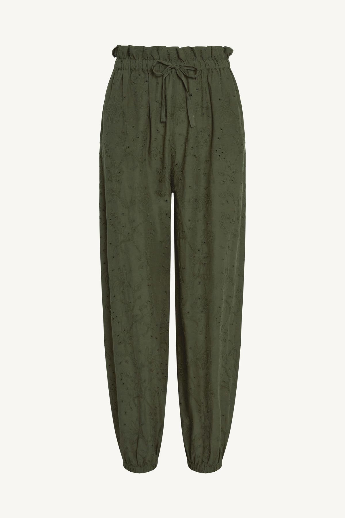 The Faye Pant is designed as an easy coverup for beach or poolside days. Made from lightweight 100% organic cotton with a soft hand and tropical eyelet pattern, its rich Olive hue adds a natural, earthy touch. Featuring a paperbag waist with drawstring and elastic for a relaxed fit, plus side seam pockets for convenience, this unlined pant layers effortlessly over swimwear for a chic, sun-ready look.
