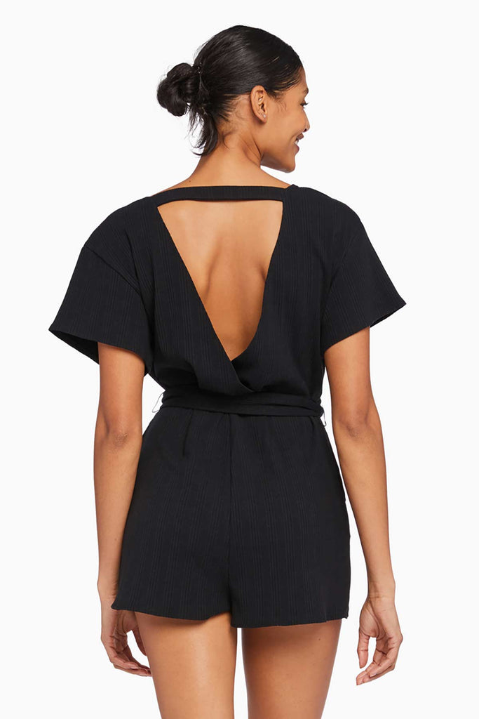 Goes on easy. A flowy romper with an adjustable tie at the waist.