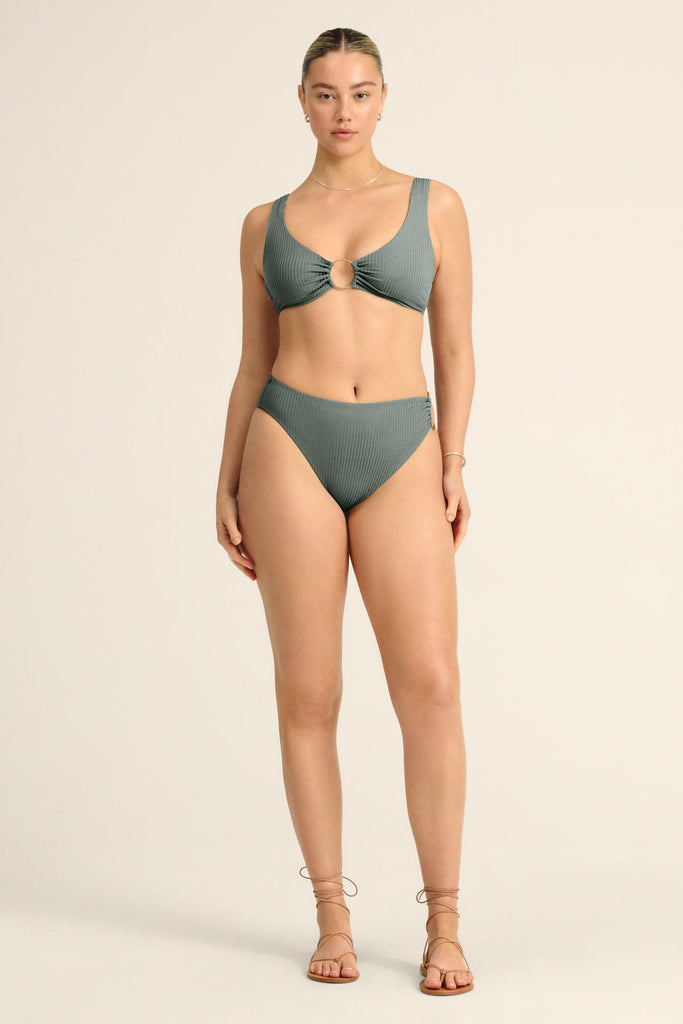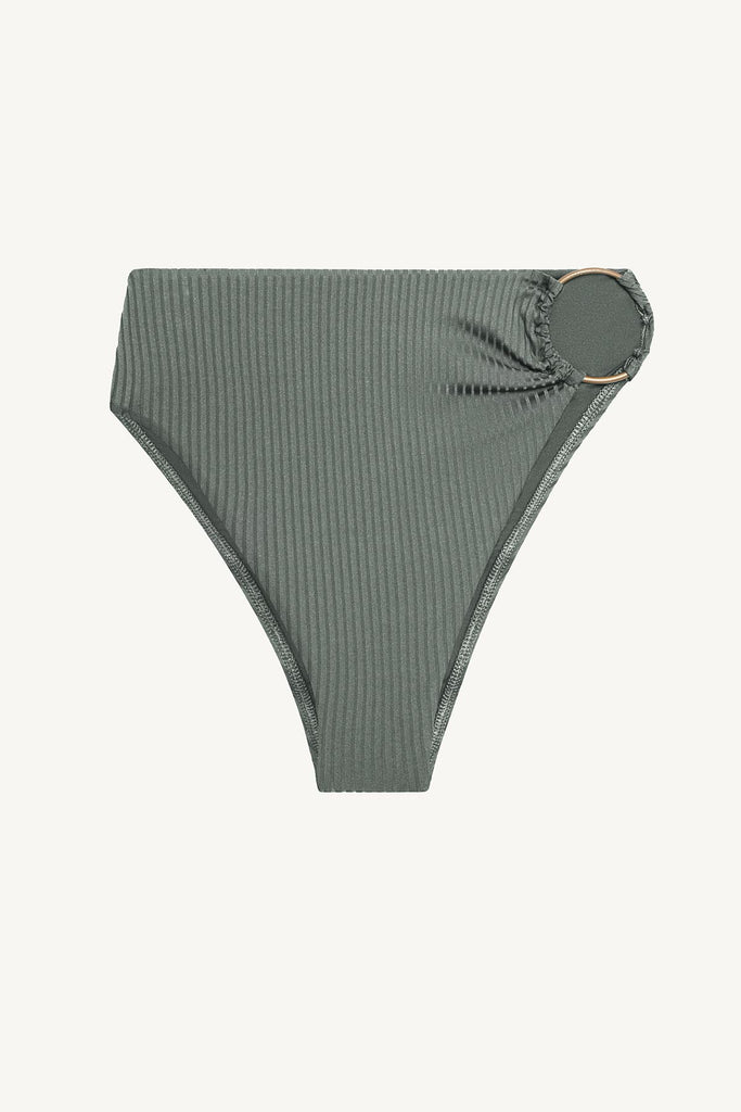 An ultra-flattering high waist bikini bottom with a cheeky cut and a matte gold ring, uniquely designed to not rust or overheat.