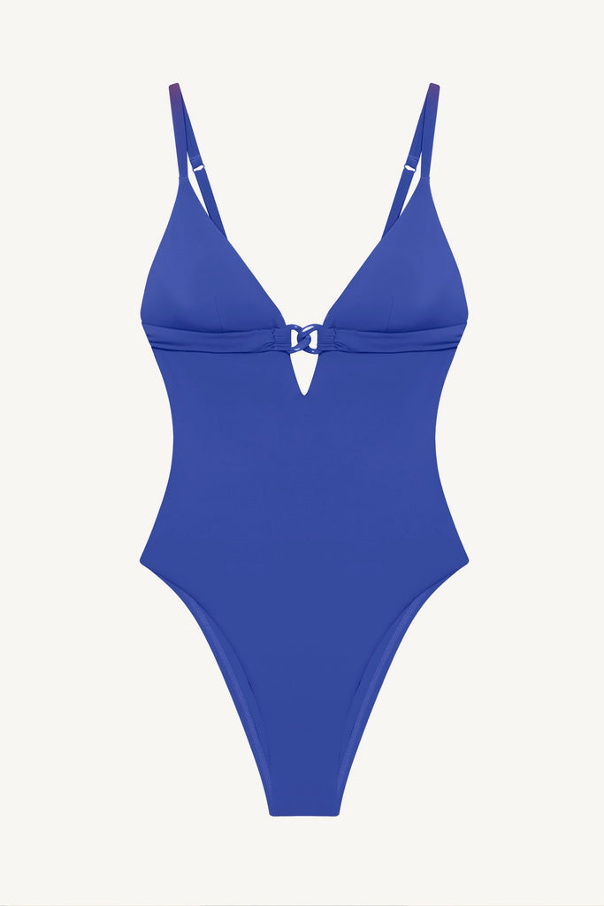 Say hello to endless summer In this classic coverage one piece, featuring adjustable over the shoulder straps+ back closure, a matte chain link detail, and removable cups.
