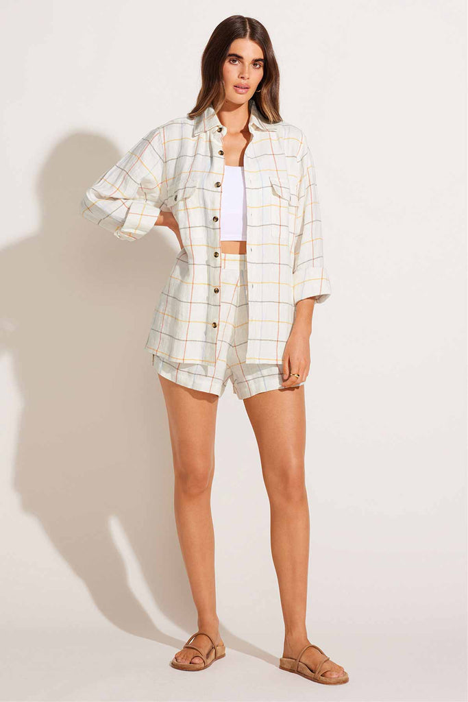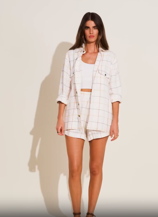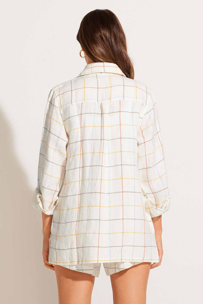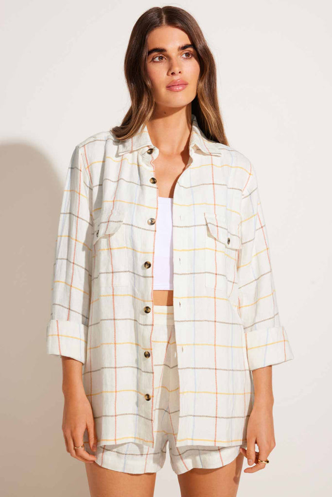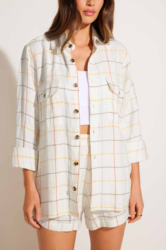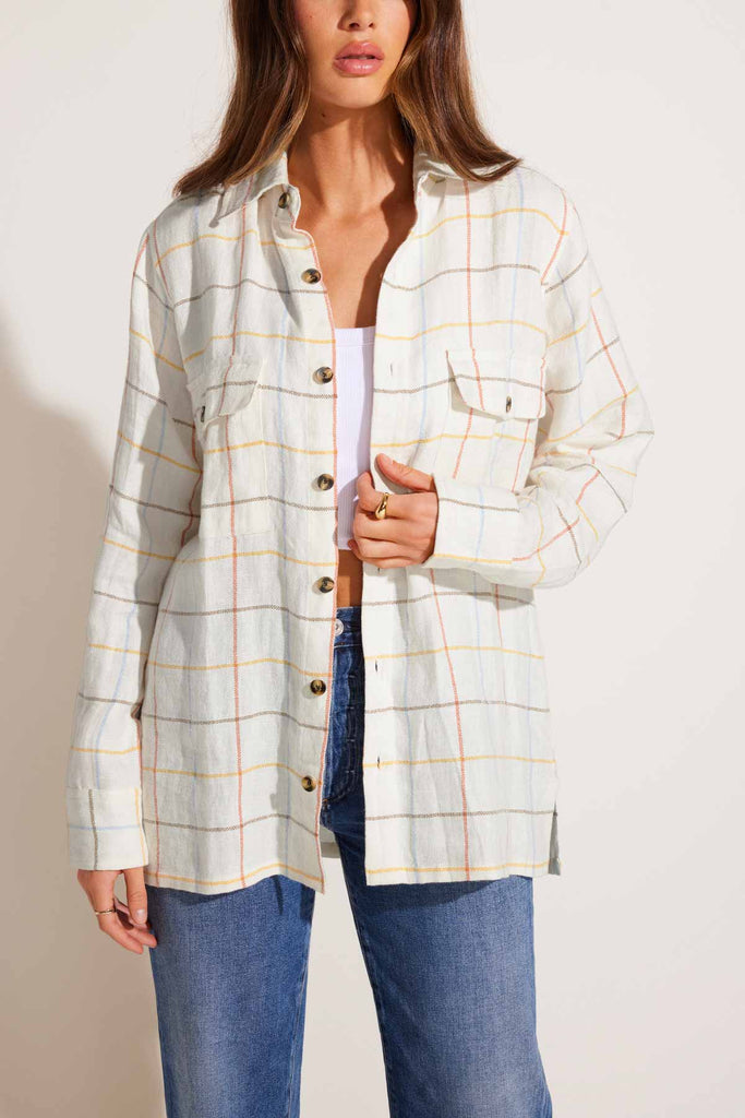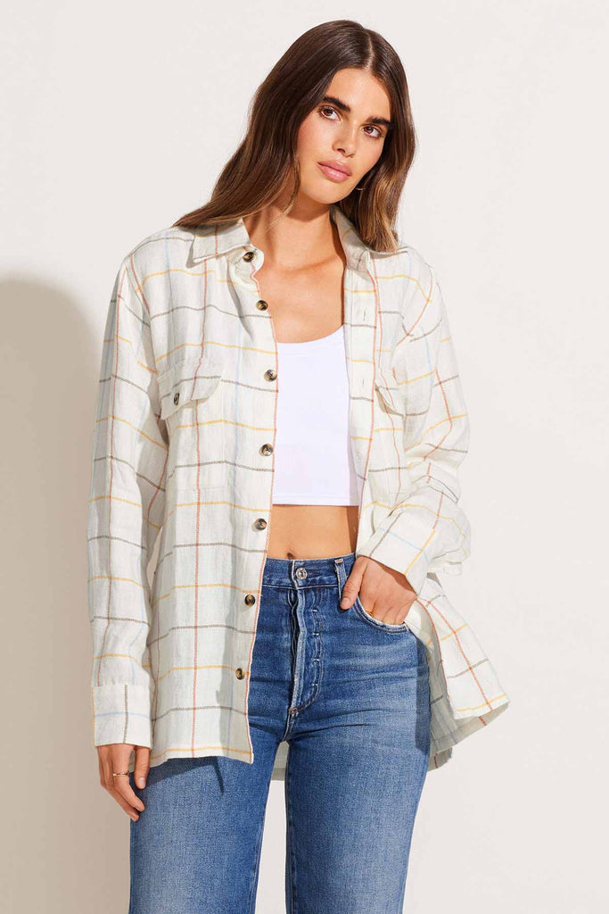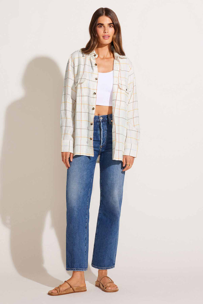 A brushed linen button-up with an oversized fit that feels as good paired with jeans and a tee as it does over-swim after a long beach day.