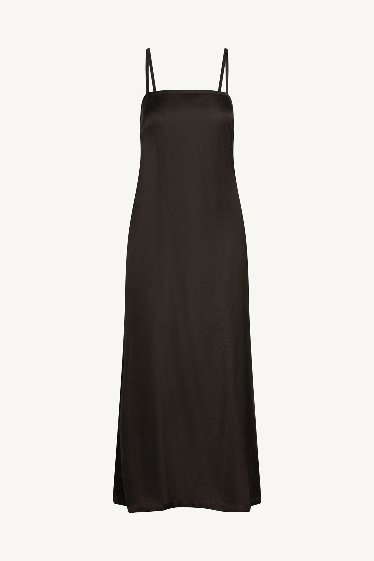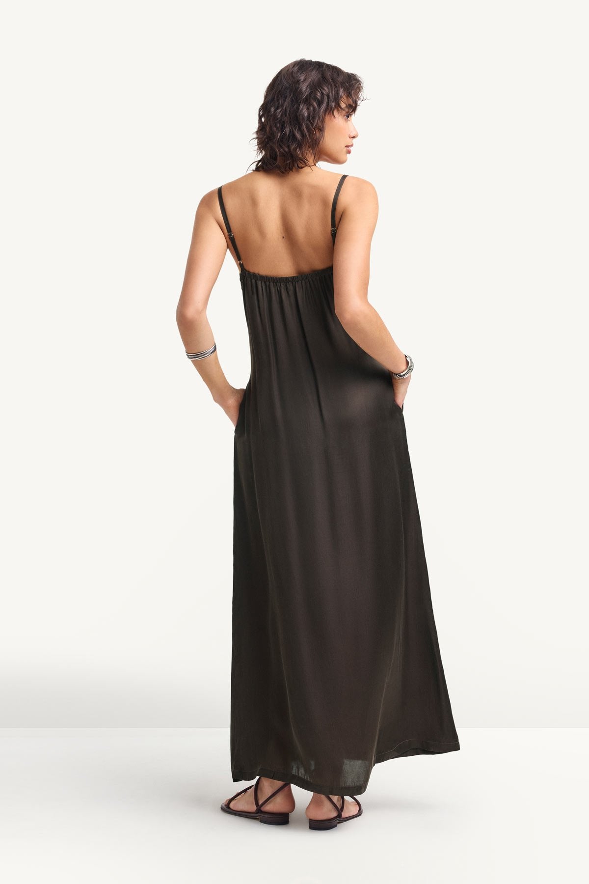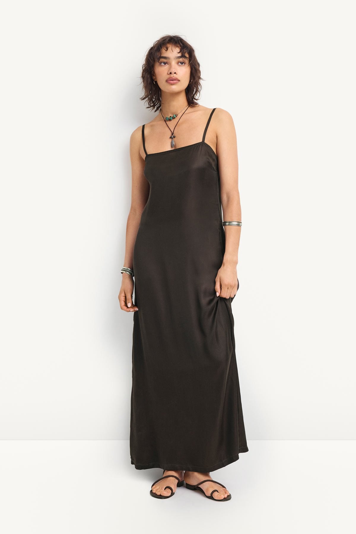 The Rhea Dress is effortlessly elegant, crafted in a soft, silky fabric with a subtle shimmer. Designed in a rich Deep Earth hue, it features a square neckline, over-the-shoulder adjustable straps, and side seam pockets for practicality. Maxi-length and versatile, it’s perfect for dressing up or everyday layering.