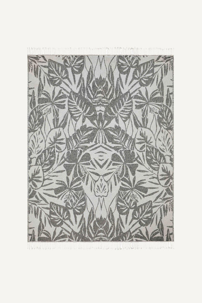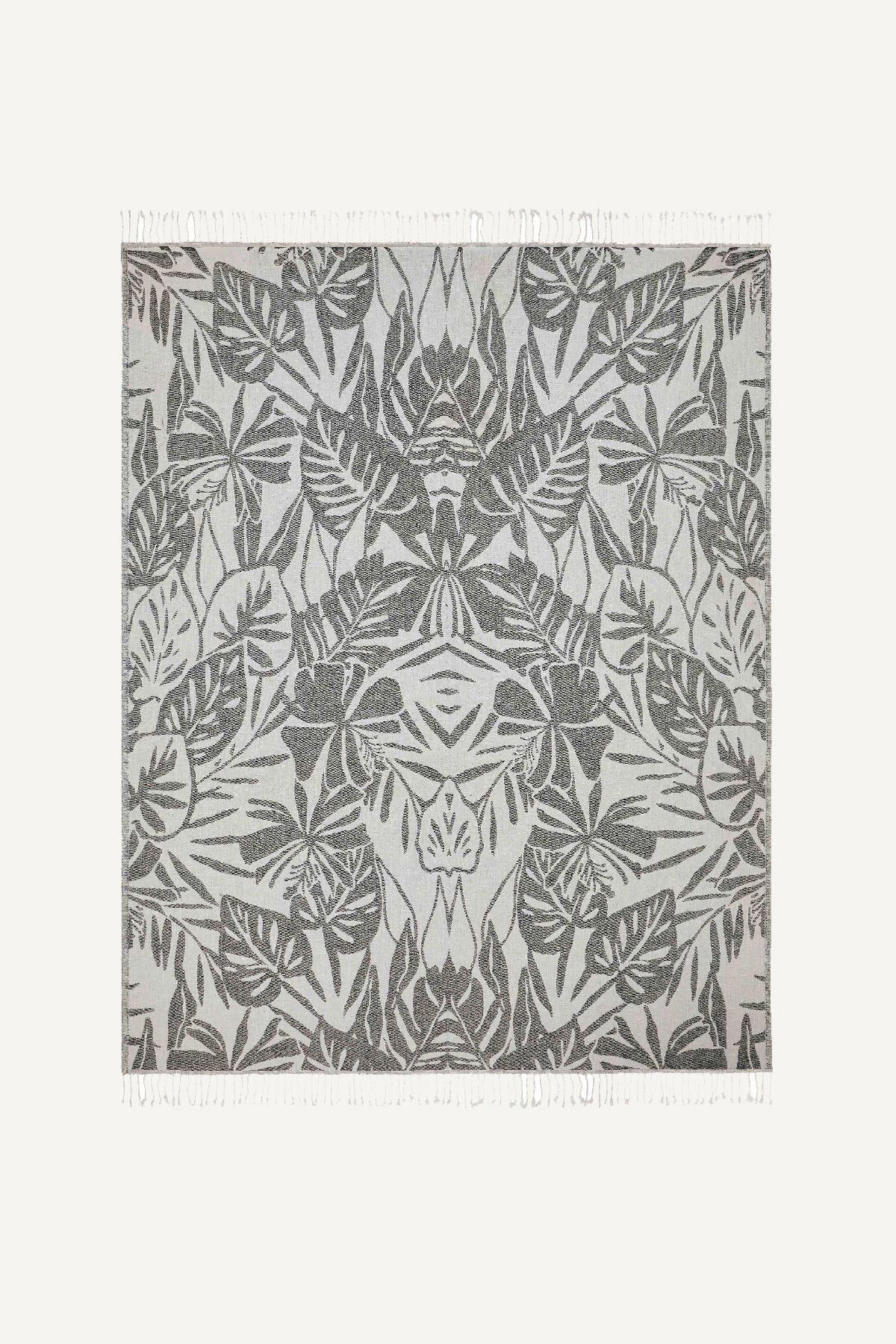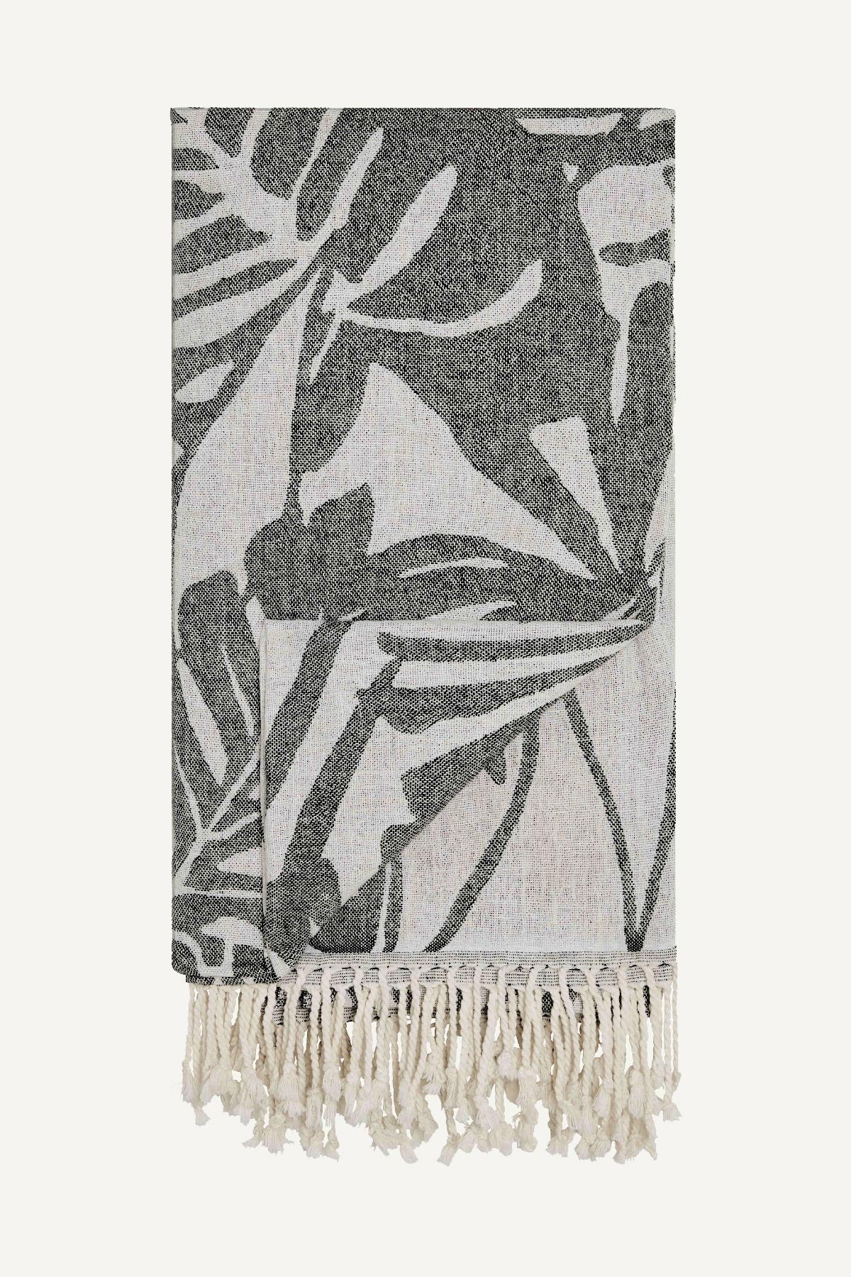 Woven from organic cotton, the Siesta Beach Blanket features a bold botanical pattern and is finished with a delicate fringe edge, it’s generously sized for lounging, sharing, or layering over your favorite outdoor spot.