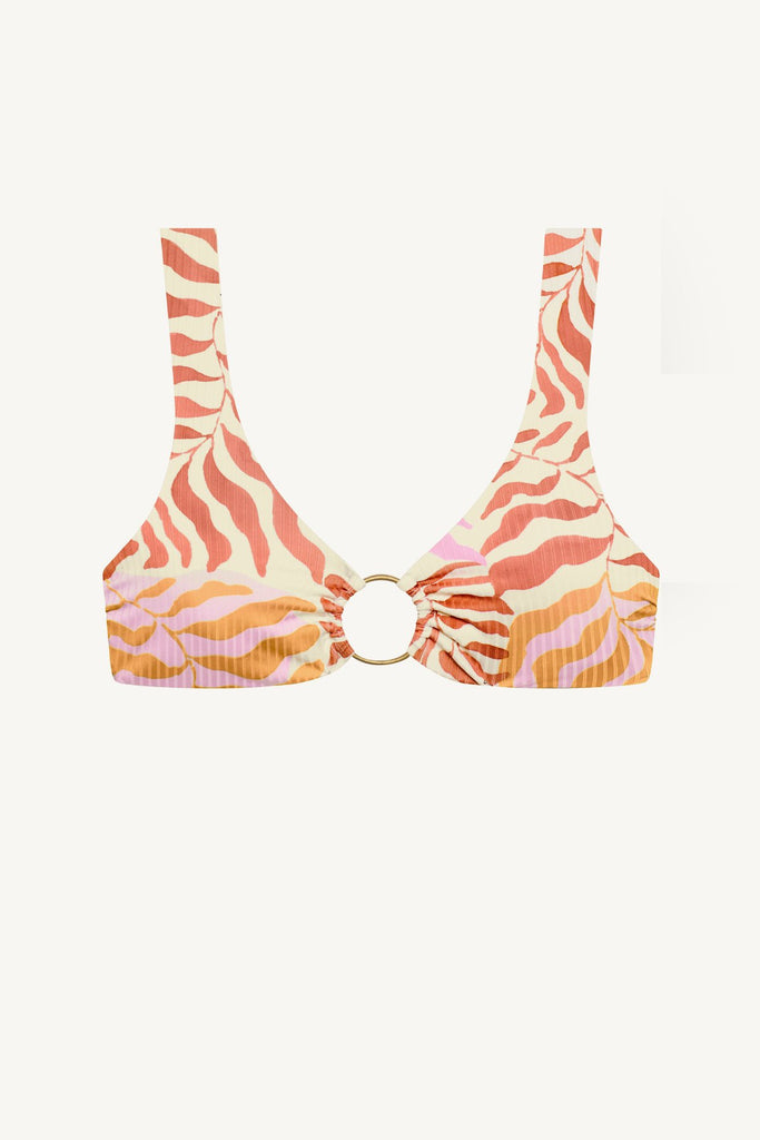 The Skylar Bralette Top features wide over the shoulder straps for support and a matte gold ring detail at the center which is uniquely designed to not rust or heat up in the sun.
