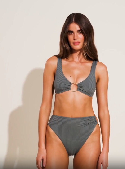 Our EcoRib fabric is a sexy, stretch-ribbed swim fabric made from nylon fabric scraps. It's lightweight, breathable and form-flattering. The EcoRib fabric is textile crafted by a mechanical regeneration system that saves .63 liters of oil and 33 liters of water per meter of fabric. Sustainably made in California. In our mission to cut plastic, this product comes in recyclable packaging.