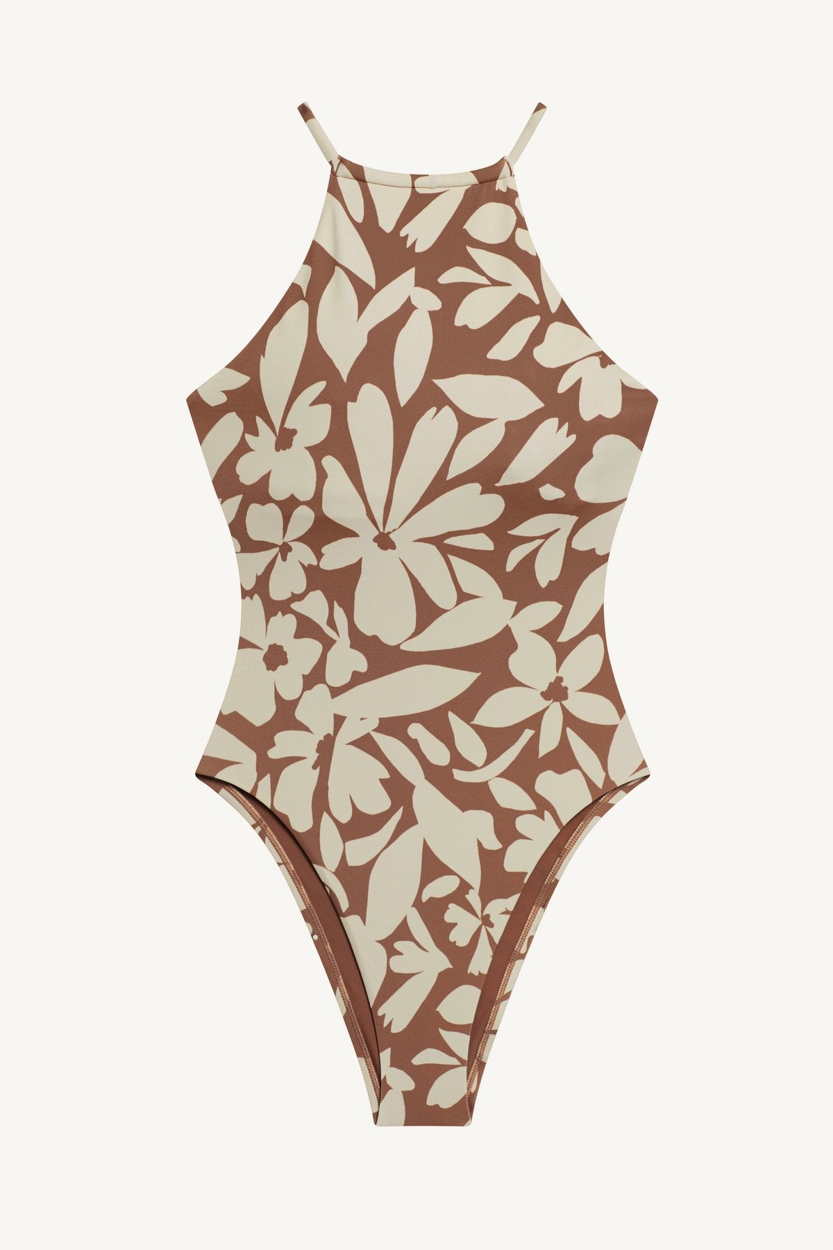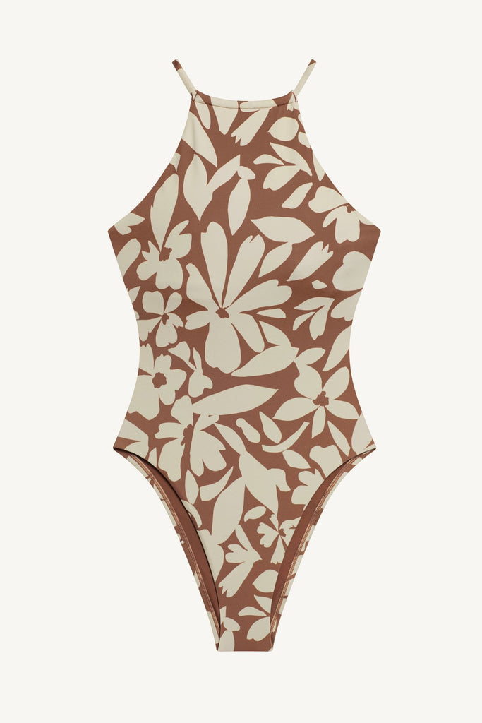 All tied up—Terra is a high neck one-piece silhouette with classic coverage and an internal shelf bra for subtle added support. Features a criss-cross tie at the back for the perfect fit and a recycled resin bead detail.